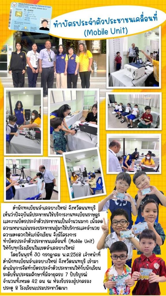 - . โดยวันพุธที่ 30 กรกฎาคม พ.ศ.2568 เจ้าหน้าที่สำนักทะเบียนอำเภอบางใหญ่ จังหวัดนนทบุรี เข้ามาบริการจัดทำบัตรประจำตัวประชาชนให้กับนักเรียนระดับชั้นประถมศึกษาที่มีอายุครบ 7 ปีบริบูรณ์ จำนวนทั้งหมด 42 คน ณ ห้องรับรองผู้ปกครอง ประตู 8 โรงเรียนเปรมประชาวัฒนา
