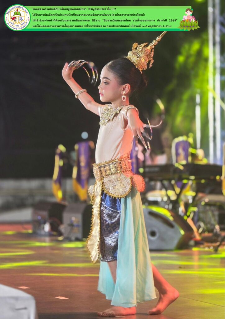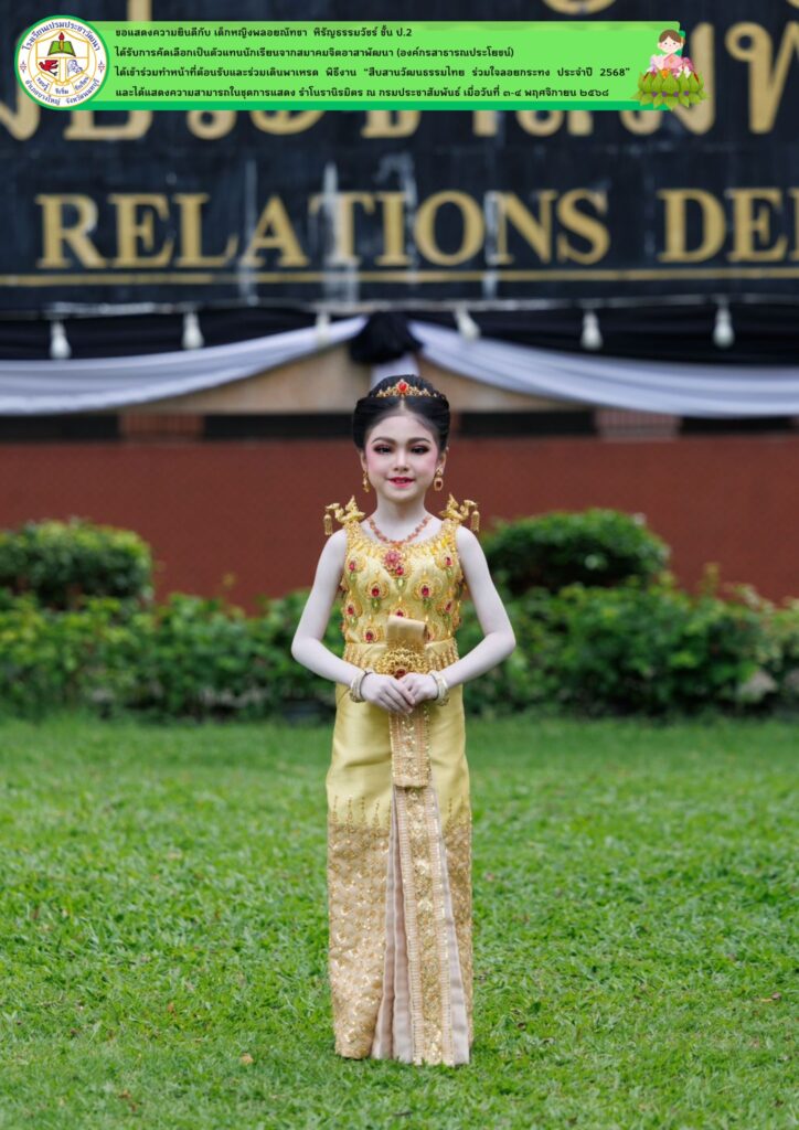 • ได้เข้าร่วมทำหน้าที่ต้อนรับและร่วมเดินพาเหรด พิธีงาน “สืบสานวัฒนธรรมไทย ร่วมใจลอยกระทง ประจำปี 2568” และได้แสดงความสามารถในชุดการแสดง รำโนรานิรมิตร ณ กรมประชาสัมพันธ์ เมื่อวันที่ ๓-๔ พฤศจิกายน ๒๕๖๘