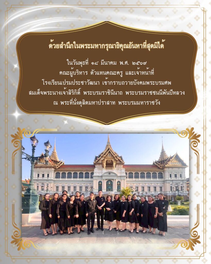 - คณะผู้บริหาร ตัวแทนคณะครู และเจ้าหน้าที่ โรงเรียนเปรมประชาวัฒนา เข้ากราบถวายบังคมพระบรมศพ สมเด็จพระนางเจ้าสิริกิติ์ พระบรมราชินีนาถ พระบรมราชชนนีพันปีหลวง ณ พระที่นั่งดุสิตมหาปราสาท พระบรมมหาราชวัง