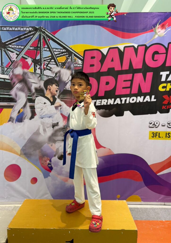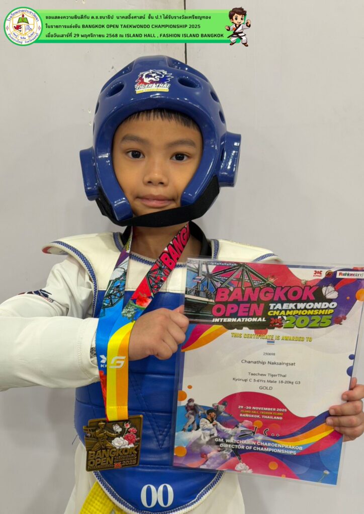 • 🏅2. เด็กชายชนาธิป นาคสอิ้งศาสน์ ชั้นประถมศึกษาปีที่ 1 ได้รับรางวัลเหรียญทอง ประเภท ต่อสู้ Class c รุ่น 5-6 ปี ชาย