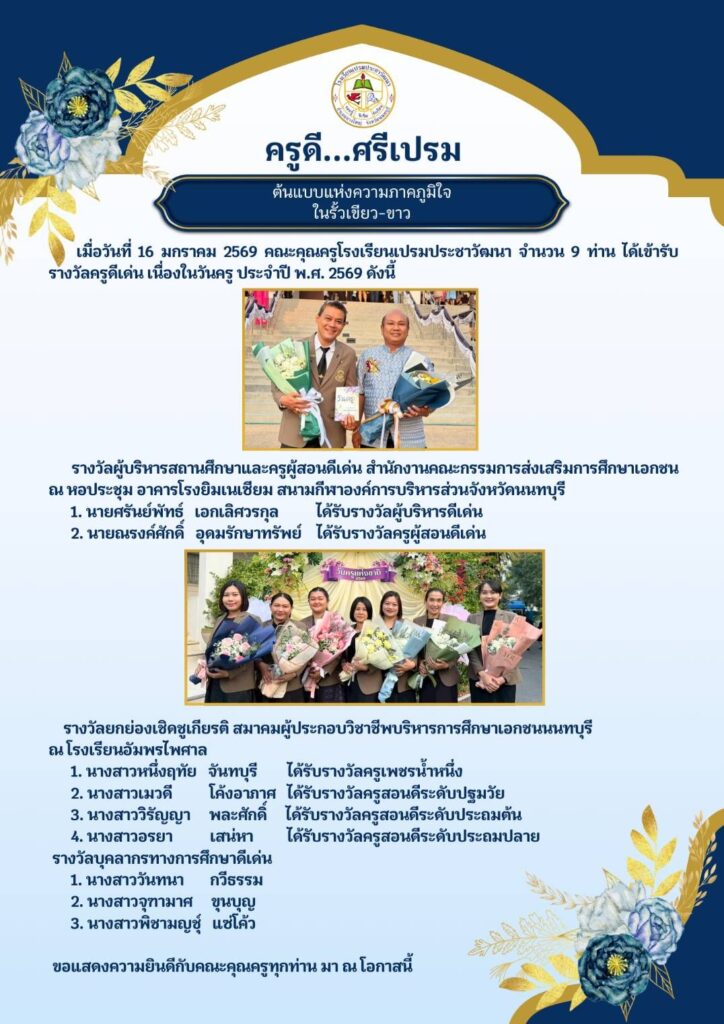 - เมื่อวันที่ 16 มกราคม 2569 คณะคุณครูโรงเรียนเปรมประชาวัฒนา จำนวน 9 ท่าน ได้เข้ารับรางวัลครูดีเด่น เนื่องในวันครู ประจำปี พ.ศ. 2569 ดังนี้