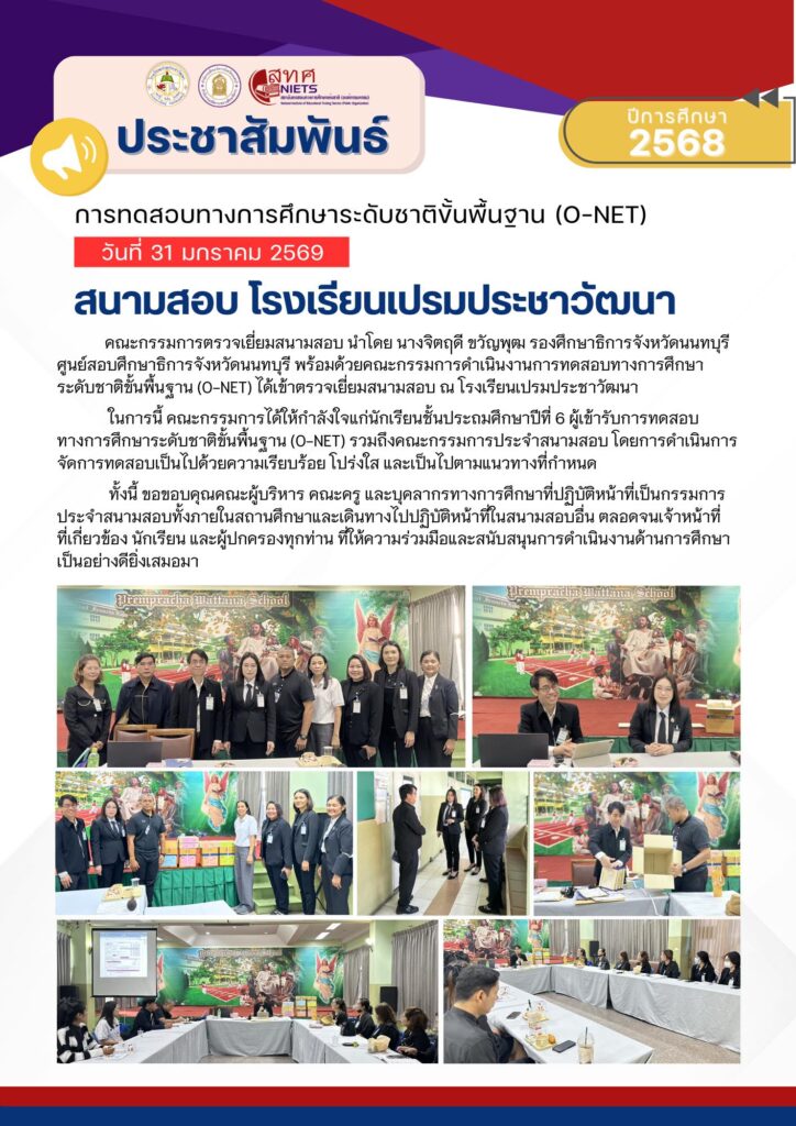 - เมื่อวันเสาร์ที่ 31 มกราคม 2569 คณะกรรมการตรวจเยี่ยมสนามสอบ นำโดย นางจิตฤดี ขวัญพุฒ รองศึกษาธิการจังหวัดนนทบุรี ศูนย์สอบศึกษาธิการจังหวัดนนทบุรี พร้อมด้วยคณะกรรมการดำเนินงานบริหารจัดการการทดสอบทางการศึกษาระดับชาติขั้นพื้นฐาน (O-NET) ได้เข้าตรวจเยี่ยมสนามสอบ ณ โรงเรียนเปรมประชาวัฒนา